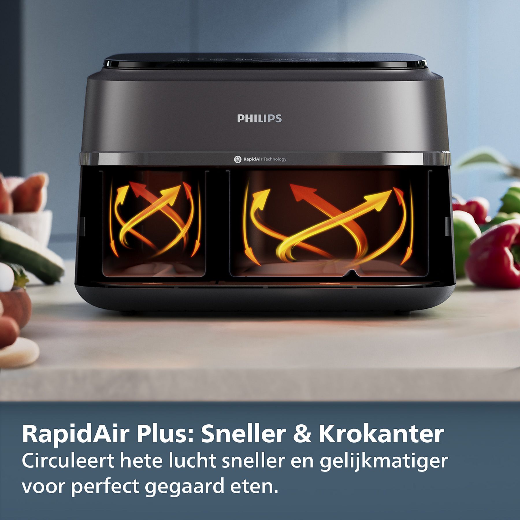 De Philips Dual Basket 3000 Serie NA352/00 is een heteluchtfriteuse met Rapid Air-technologie. Deze versie heeft niet één, maar 2 manden om eten in te bereiden. Zo bereid je in een handomdraai grote porties van een breed scala aan gerechten, met minder vet dan traditionele friteuses.