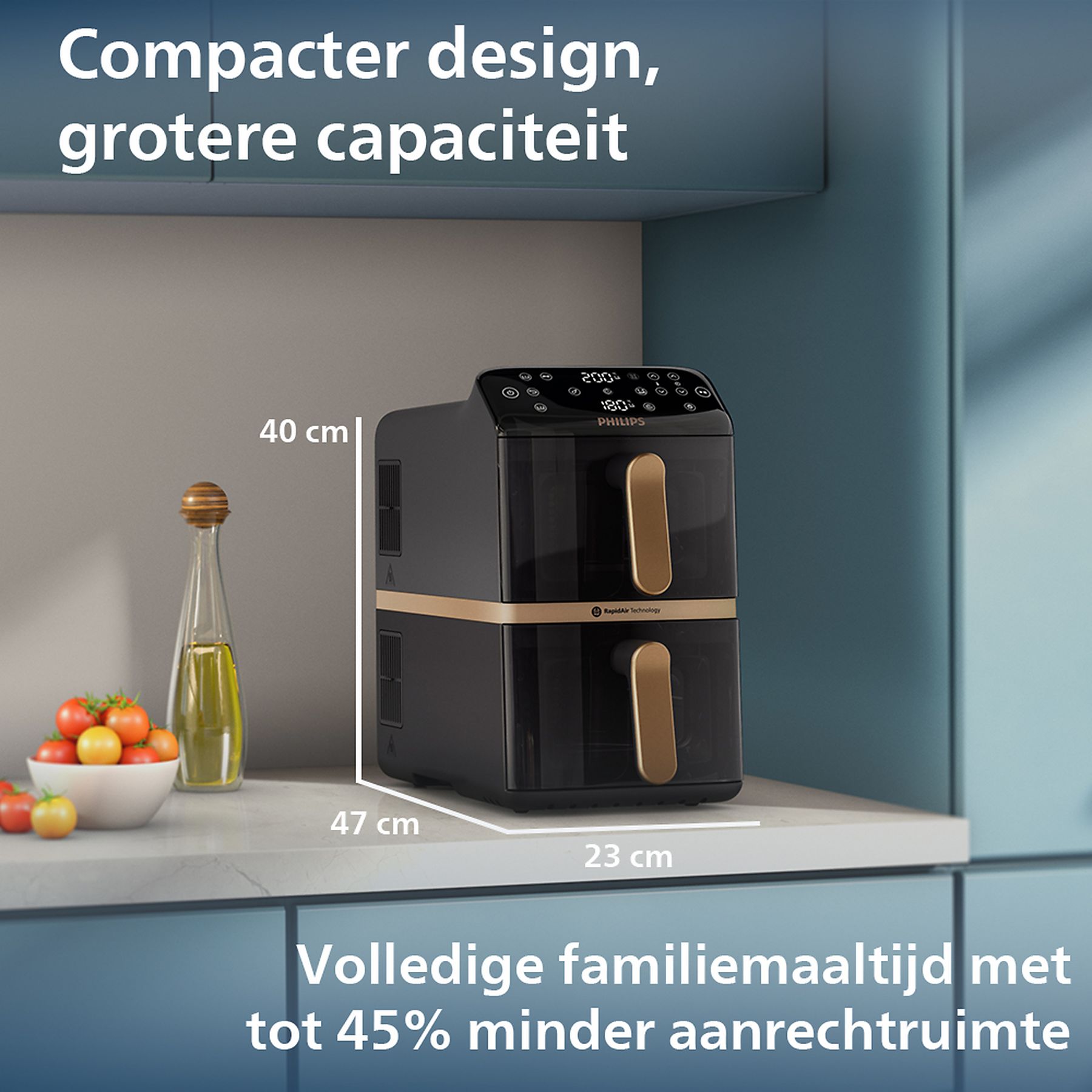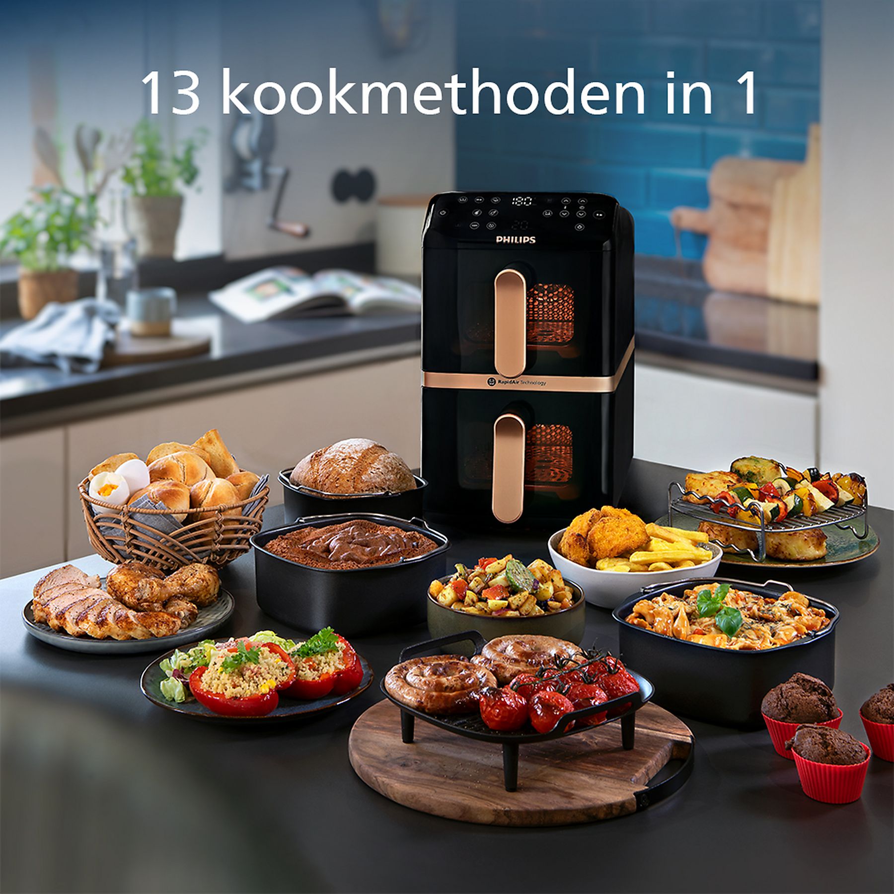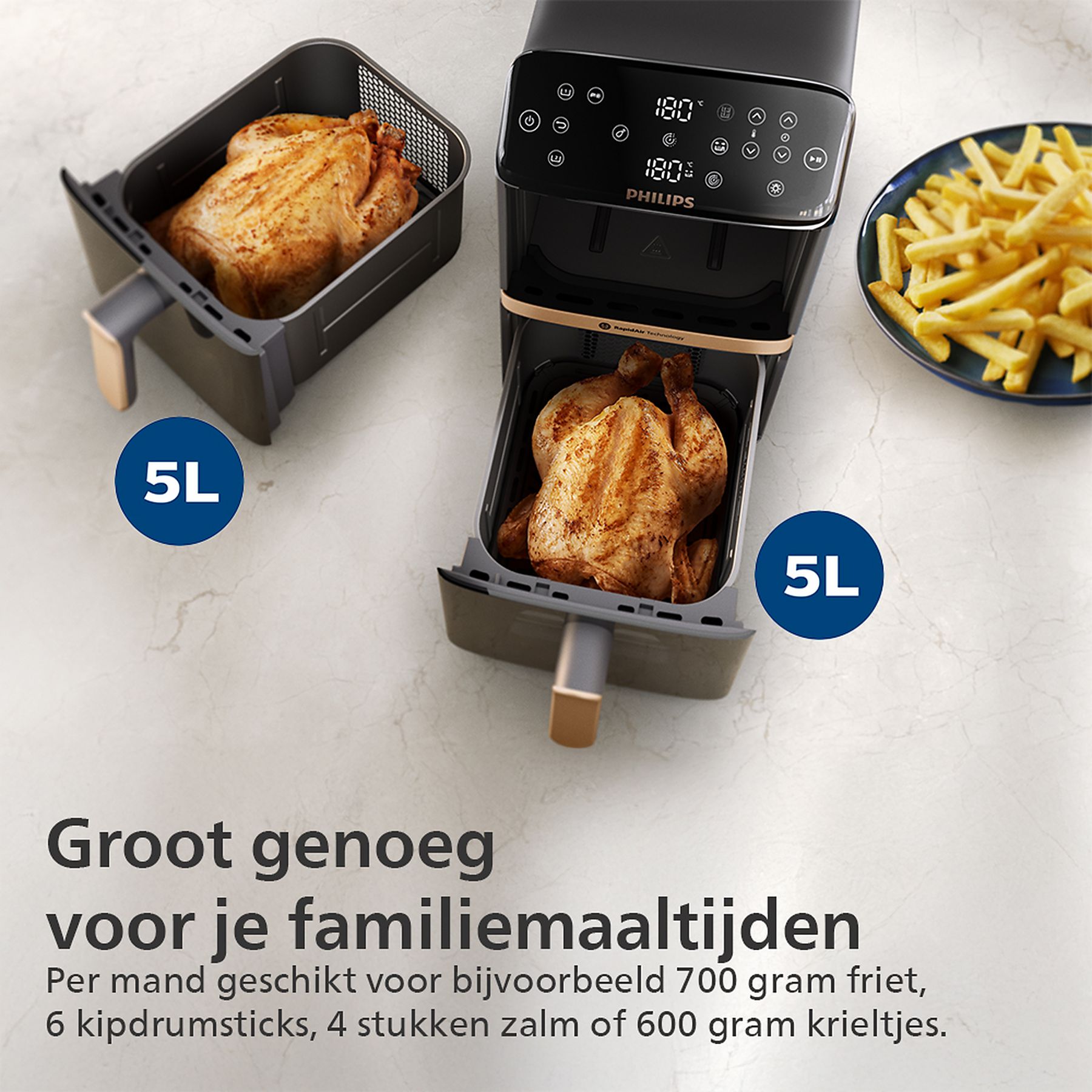 De Philips NA462/70 heteluchtfriteuse maakt gezonder koken mogelijk met hete lucht in plaats van olie. Hierdoor krijgen snacks en andere maaltijden een knapperige buitenkant en blijven ze licht en smaakvol. Dankzij de 2 aparte compartimenten kun je tegelijk verschillende gerechten bereiden, zoals frietjes en groentes. De instelbare temperatuur en gebruiksvriendelijke bediening zorgen ervoor dat bakken, grillen en roosteren steeds met een consistent resultaat lukt. Deze friteuse is een praktische oplossing voor gevarieerde en smakelijke maaltijden in het dagelijks koken.