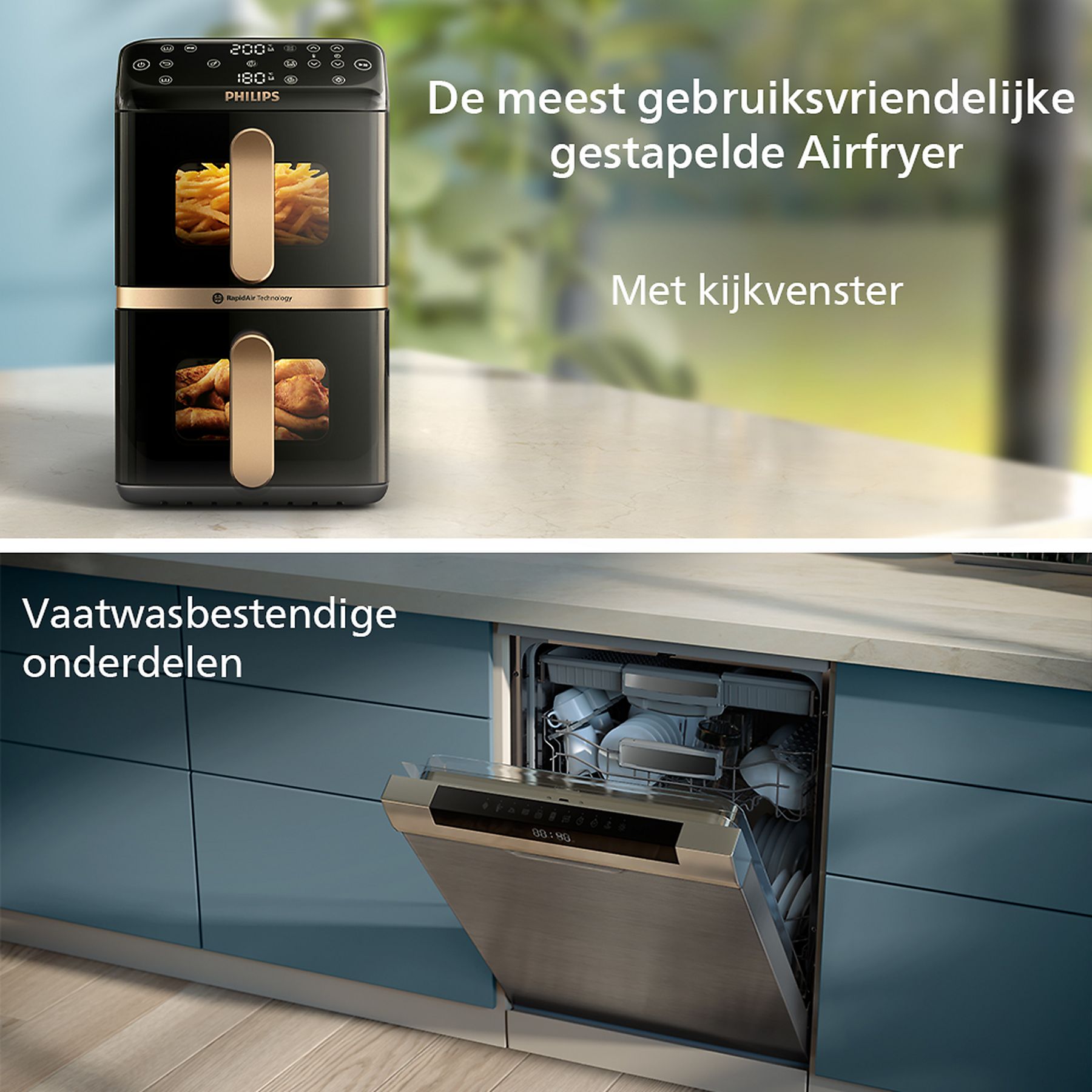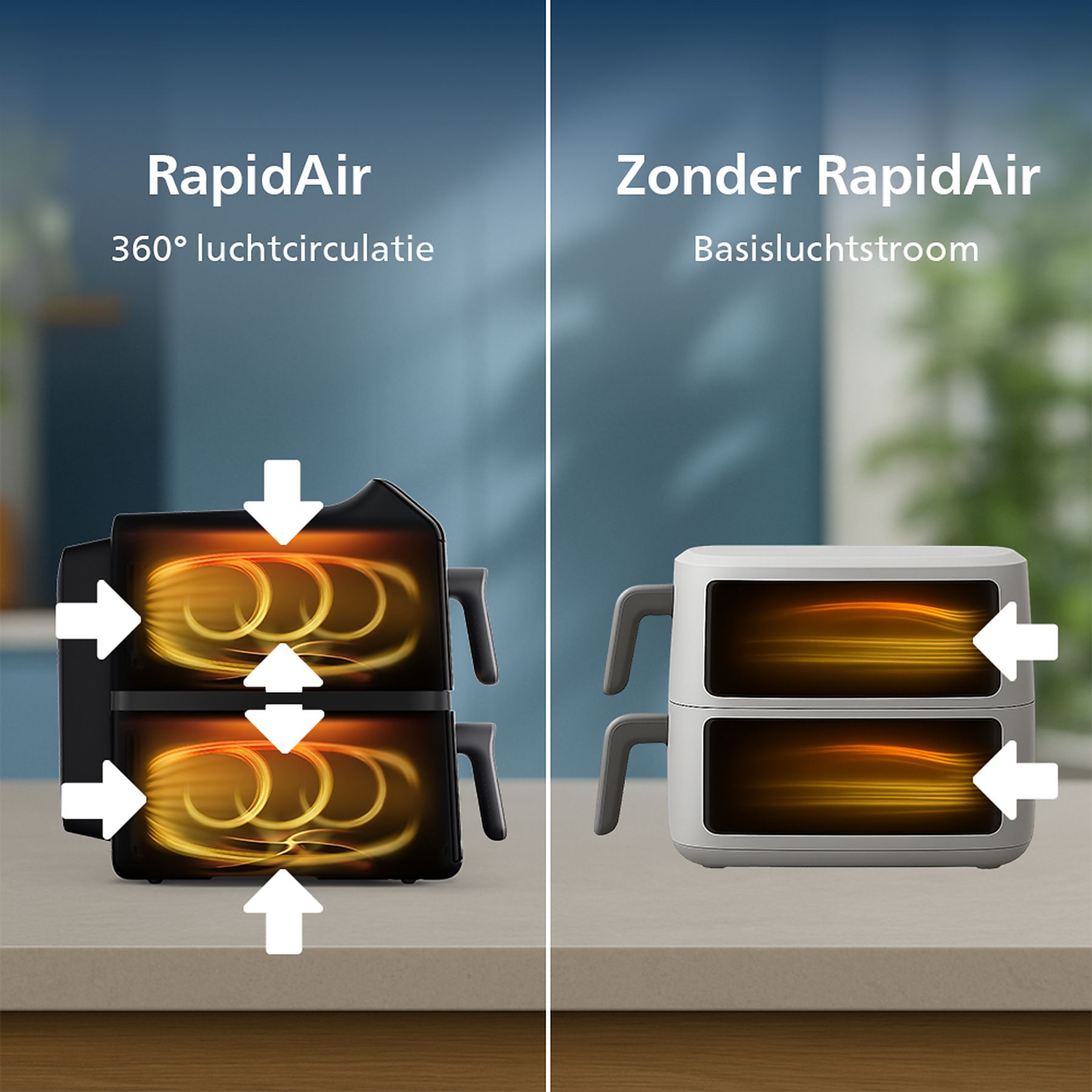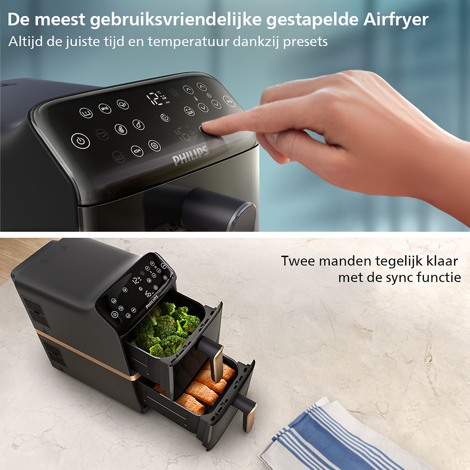 De Philips NA462/70 heteluchtfriteuse maakt gezonder koken mogelijk met hete lucht in plaats van olie. Hierdoor krijgen snacks en andere maaltijden een knapperige buitenkant en blijven ze licht en smaakvol. Dankzij de 2 aparte compartimenten kun je tegelijk verschillende gerechten bereiden, zoals frietjes en groentes. De instelbare temperatuur en gebruiksvriendelijke bediening zorgen ervoor dat bakken, grillen en roosteren steeds met een consistent resultaat lukt. Deze friteuse is een praktische oplossing voor gevarieerde en smakelijke maaltijden in het dagelijks koken.